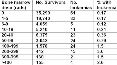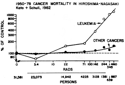 In May 1985, a U.S. National Research Council report on mortality in nuclear weapons test participants raised several questions. Some 5,113 nuclear test participants had died between 1952-81, when 6,125 deaths would be expected for a similar sized group of non-exposed Americans. The number of leukemia deaths was 56, identical to that in a similar sized non-exposed group. However, as the graph at the top of this post shows, the risk depends on the dose, so the few people with the highest doses would have far greater risks. In 1983, a C.D.C. report on the effects of fallout from the Plumbbob-Smoky test in 1957 showed that 8 participants in that test has died from leukemia up to 1979, compared to only 3 expected from a similar sized sample of non-exposed Americans. However, even for the Plumbbob-Smoky test, the overall death rate from all causes in the exposed test participants (320 deaths from 1957-79) was less than that in a matched sample of non-exposed Americans (365 deaths). The average dose to American nuclear test participants was only about 0.5 rad, although far higher doses were received by those working with fallout soon after nuclear tests. Altogether, out of 205,000 U.S. Department of Defense participants in nuclear tests, 34,000 were expected to die from naturally occurring cancer, and 11 from cancer due to radiation exposure. (According to the March 1990 U.S. Defense Nuclear Agency study guide DNA1.941108.010, report HRE-856, Medical Effects of Nuclear Weapons.