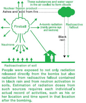 Above: by the time that the mass fires developed in the wooden homes of Hiroshima (breakfast time) and Nagasaki (lunch time) from blast wind-overturned cooking braziers, paper screens, and bamboo furnishings, the mushroom cloud has been blown away by the wind. The moisture and soot from the firestorm in Hiroshima which condensed to a 'black rain' when it had risen and cooled above the city, fell on the city an hour or two after the explosion and did not intersect the radioactive mushroom cloud, which had attained much higher altitude than the firestorm soot and moisture in any case. The neutron induced activity doses from the ground were trivial compared to the outdoor initial nuclear radiation doses, as illustrated in a previous post using the latest DS02 dosimetry. The RERF propaganda seeks to discredit civil defence by false propaganda, a continuation of the fellow travelled Cold War Soviet communist propaganda against Western defenses.