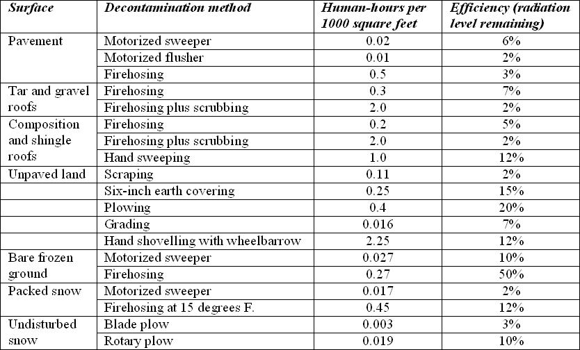 There is other extensive data on fallout decontamination in many previous posts on this blog, e.g., as the posts here, here and here (this last link includes a slightly different table of decontamination efficiencies, which is interesting to compare to the table of data above), as well as several other earlier ones. In summing up the situation for urban area decontamination, Cowan and Meinhold state on p. 232: